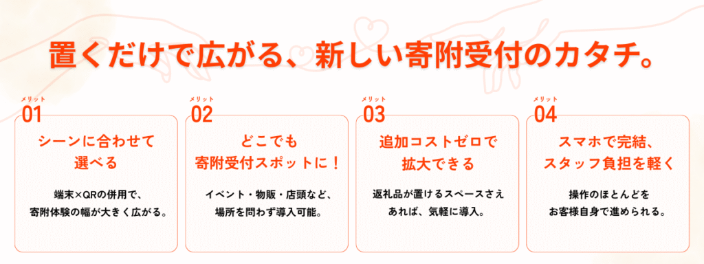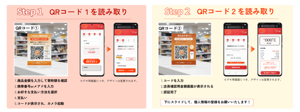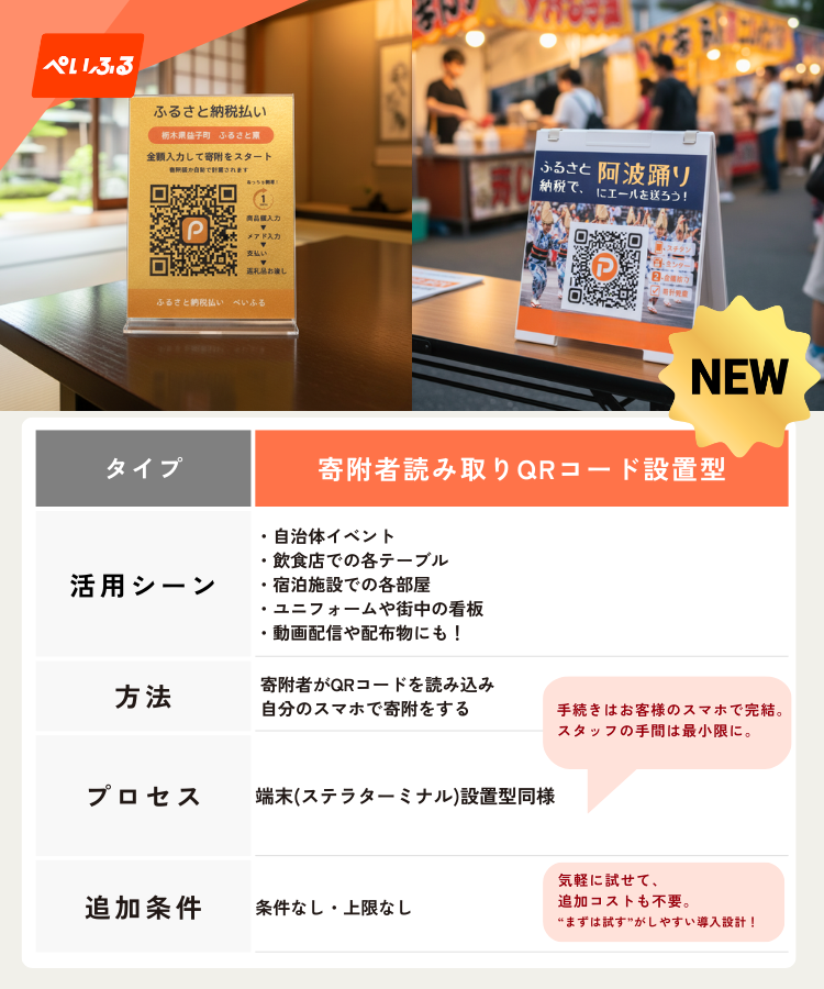新登場!QRコードでふるさと納税! 寄附の“熱”を逃さない。QRコード寄附受付、ついに新登場。 ぺいふるは寄附者の「今届けたい」という瞬間を止めない仕組みを追求しています。その体験をさらに進化させるため、現地寄附受付が端末型+QR型の2つの方法 から選べるようになりました。 2つの方法でふるさと納税寄附受付可能に! 場所を選ばず展開できる、QR式の新しい寄附受付。 寄附の流れは端末型と同じく「アプリ不要」「事前準備不要」。お客様のスマホだけで進められる、シンプルで迷わないプロセスです。 ▷お客様操作の流れ 届いたメッセージから寄附控除のための申請を行う より良い地域社会実現の取り組みを、 ご一緒できれば幸いです。 お問い合わせはこちらから